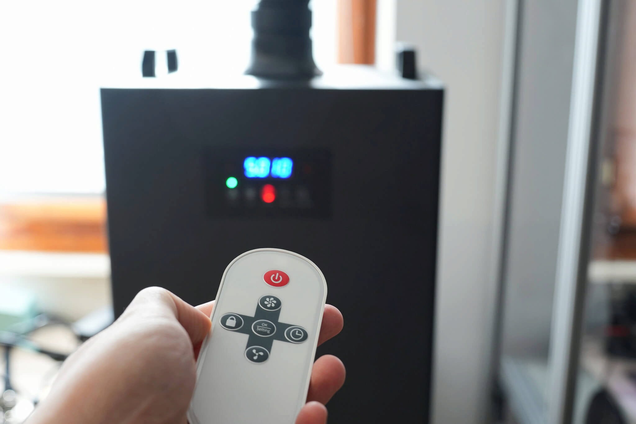 Para mayor comodidad, el sistema está equipado con una función de control inteligente con mando a distancia. Puede encender y apagar el aparato, ajustar el caudal de aire de 0 a 100 %, comprobar las horas de funcionamiento o restablecer las alarmas. La función de bloqueo del panel evita cambios accidentales de los ajustes.