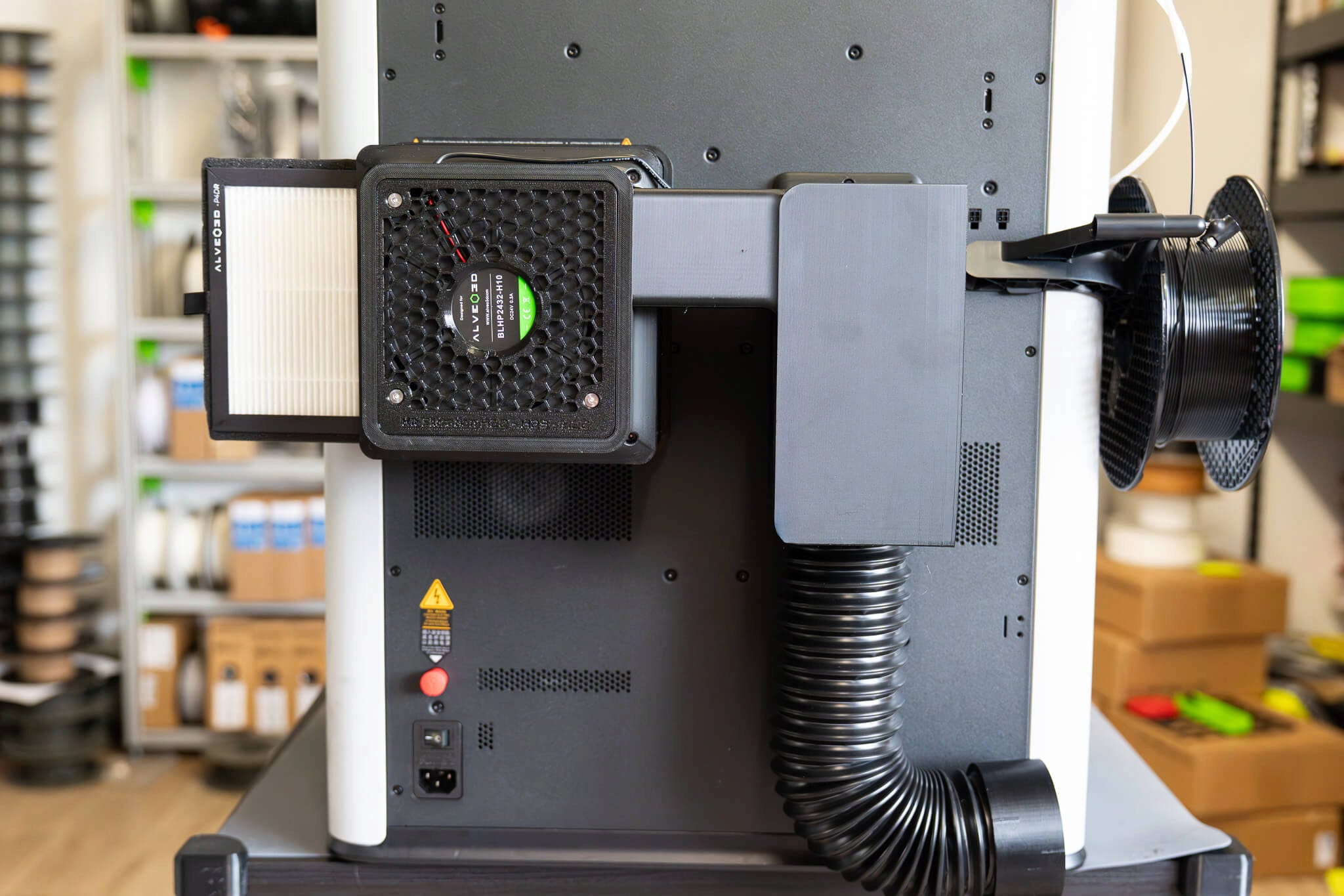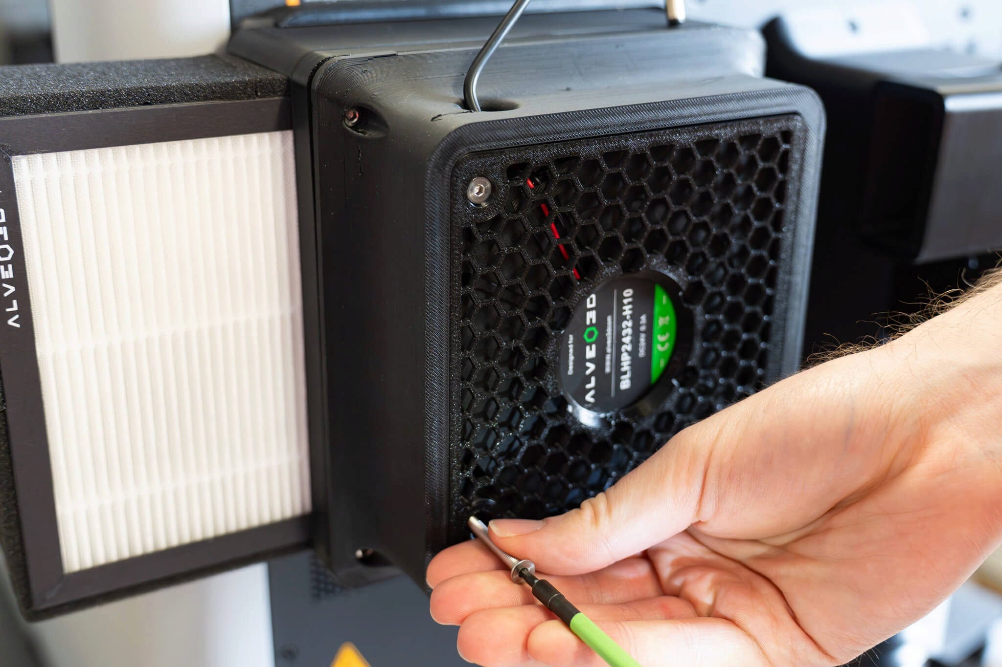 El sistema combina un filtro HEPA14, que atrapa de forma fiable las partículas ultrafinas de UFP en el aire de escape, con carbón activado que neutraliza los compuestos orgánicos volátiles (COV) y los olores desagradables. Esto reduce significativamente la carga de emisiones en el entorno de trabajo, mejorando las condiciones de funcionamiento durante la impresión de materiales técnicos.