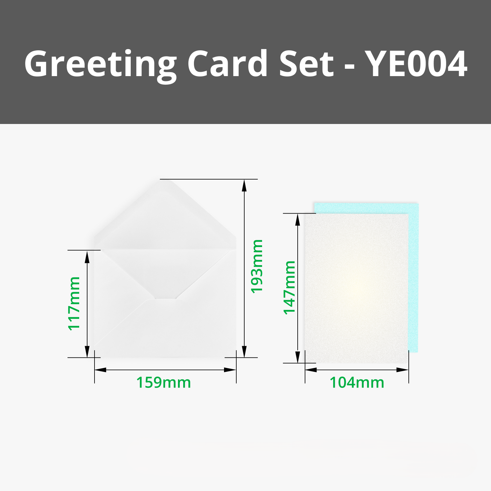 La entrega incluye 2 tarjetas de felicitación blancas nacaradas (147 x 104 mm) con un sobre a juego (159 x 117 mm).