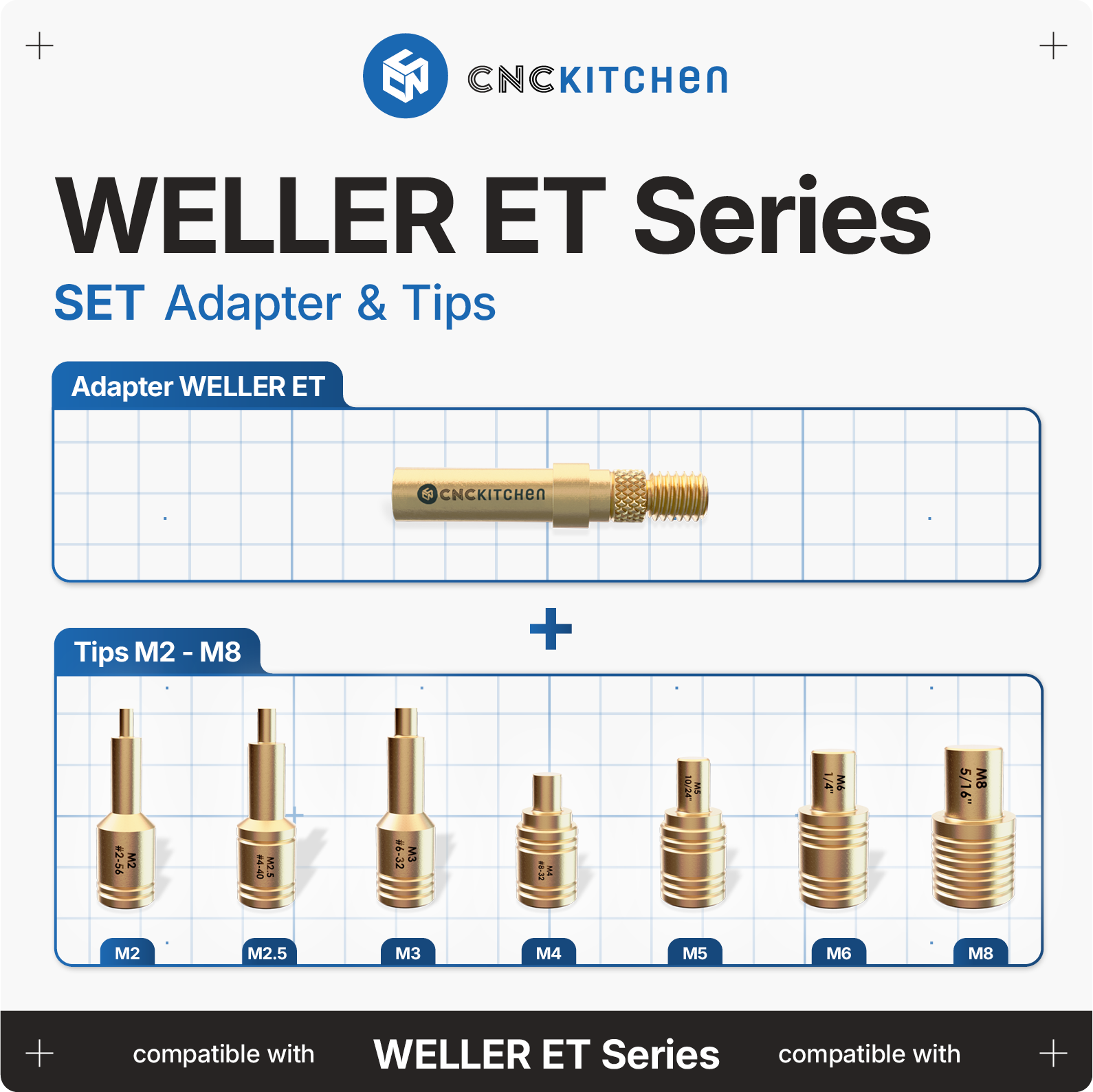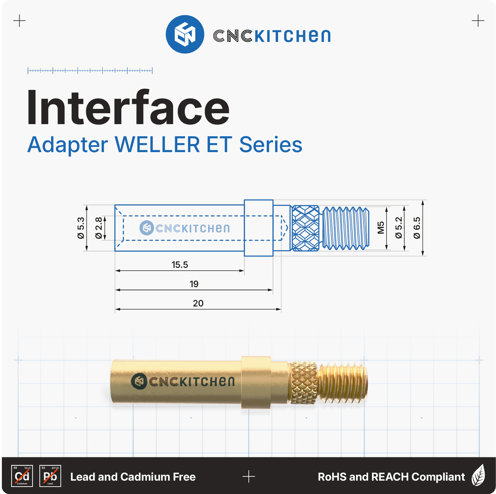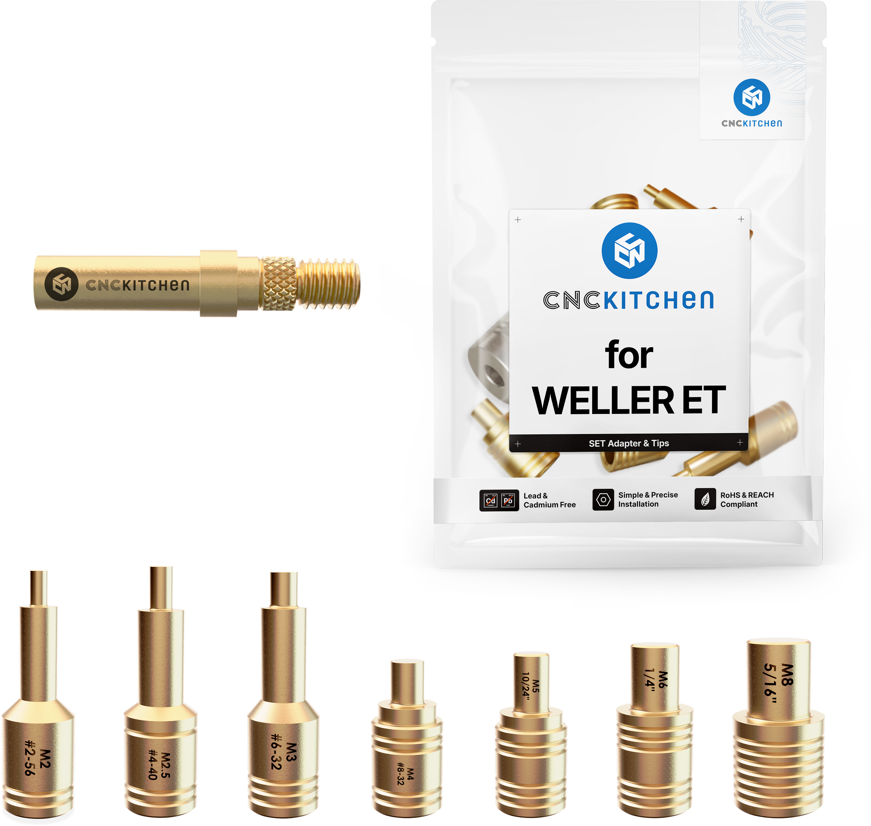 Las puntas de soldadura son compatibles con los soldadores Weller WES50/51, WESD51, PES50/51, WE1010, LR21 ET y muchos más* y se adaptan perfectamente a los insertos roscados CNC Kitchen. Las puntas de soldadura están marcadas con láser y muescas para identificar fácilmente el tamaño. Cumple con REACH y RoHS.