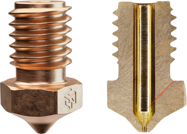 Fabricada en latón sin plomo, esta boquilla V6 de CNC Kitchen combina sostenibilidad y rendimiento. La mano de obra de alta precisión y la superficie lisa garantizan un flujo de material uniforme y resultados de impresión óptimos. Gracias a la punta sin rebabas, las obstrucciones son cosa del pasado, mientras que la transición de 60° guía el filamento de manera eficiente y garantiza una transición perfecta.