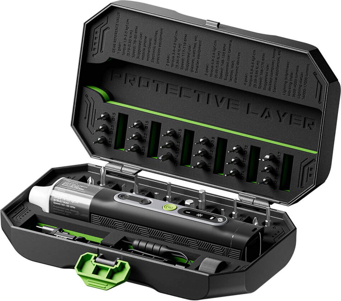 Con cuatro niveles de par de apriete seleccionables, afronta cualquier trabajo con facilidad: desde delicadas reparaciones de dispositivos electrónicos hasta el montaje de muebles o proyectos de bricolaje. Cada tornillo se aprieta de forma segura, precisa y respetuosa con el material.