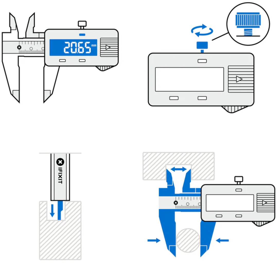 Con el calibrador digital iFixit podrás realizar mediciones precisas, rápidas y sin incertidumbres con una resolución de hasta 0,01 mm. Con una longitud de medición de hasta 150 mm, cubre fácilmente la mayoría de las aplicaciones de reparación, fabricación y técnicas.