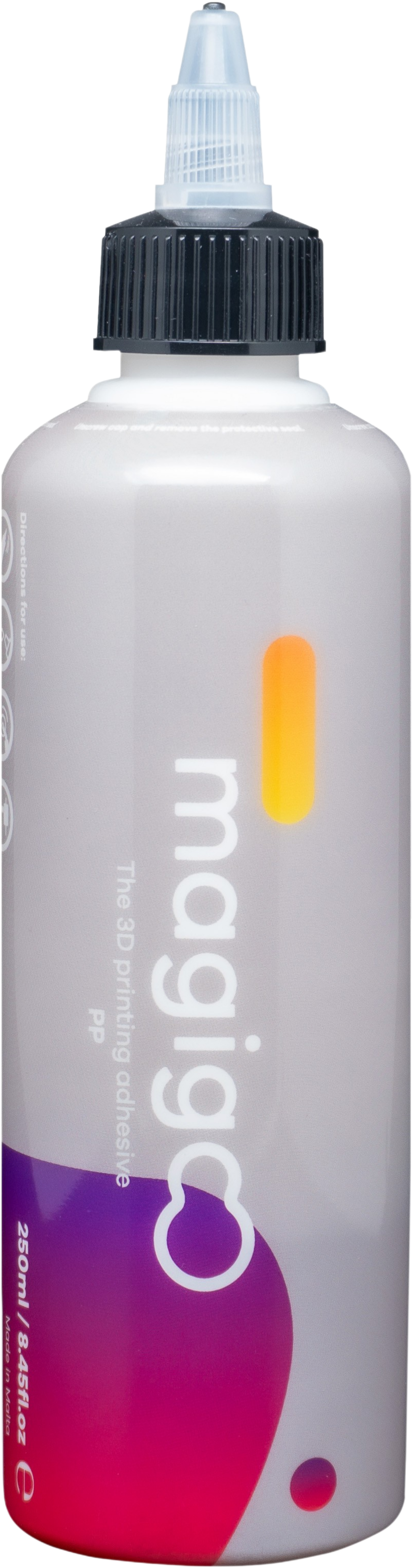 Magigoo Glide PP es un adhesivo para lecho de impresión altamente especializado de la serie Pro, desarrollado específicamente para la impresión de filamentos de polipropileno (PP) y materiales compuestos a base de PP. El polipropileno es uno de los materiales técnicos más difíciles en la impresión FDM, ya que su superficie extremadamente apolar y su marcado comportamiento de contracción hacen casi imposible una adhesión fiable a las placas de impresión convencionales.