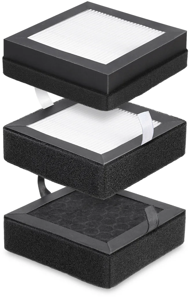 - Sistema de filtración 3 en 1: Prefiltro, HEPA H13, carbón activado