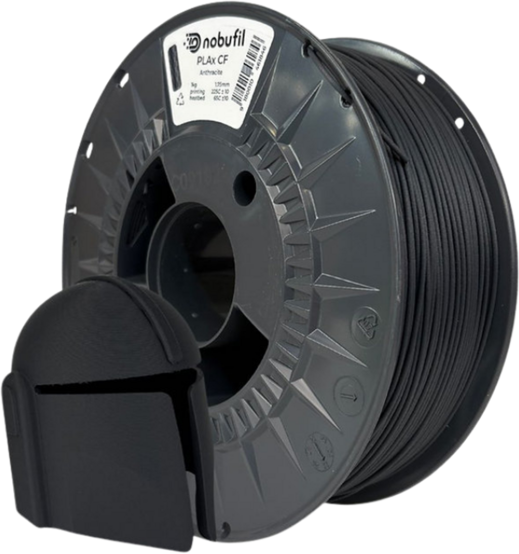 PLAx CF de Nobufil es un filamento de PLA reforzado con carbono fabricado a partir de plásticos reciclados derivados de residuos de producción durante el procesamiento industrial. Gracias a una modificación especial para aumentar la resistencia al impacto y a la adición de fibras de carbono de alta resistencia, este material compuesto ofrece una combinación de estabilidad, ligereza e impresionante resistencia mecánica que lo hace especialmente adecuado para aplicaciones funcionales y técnicas.