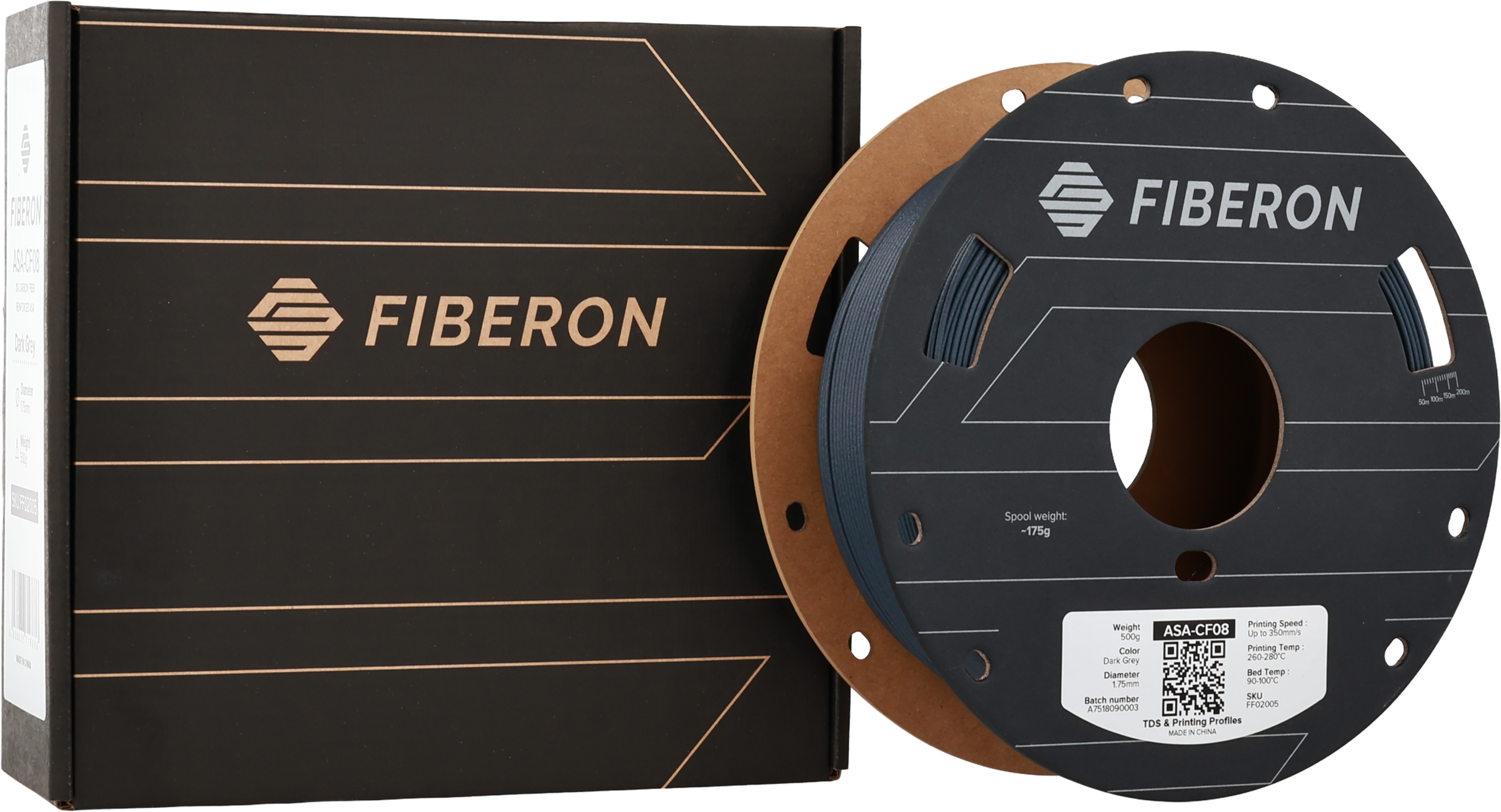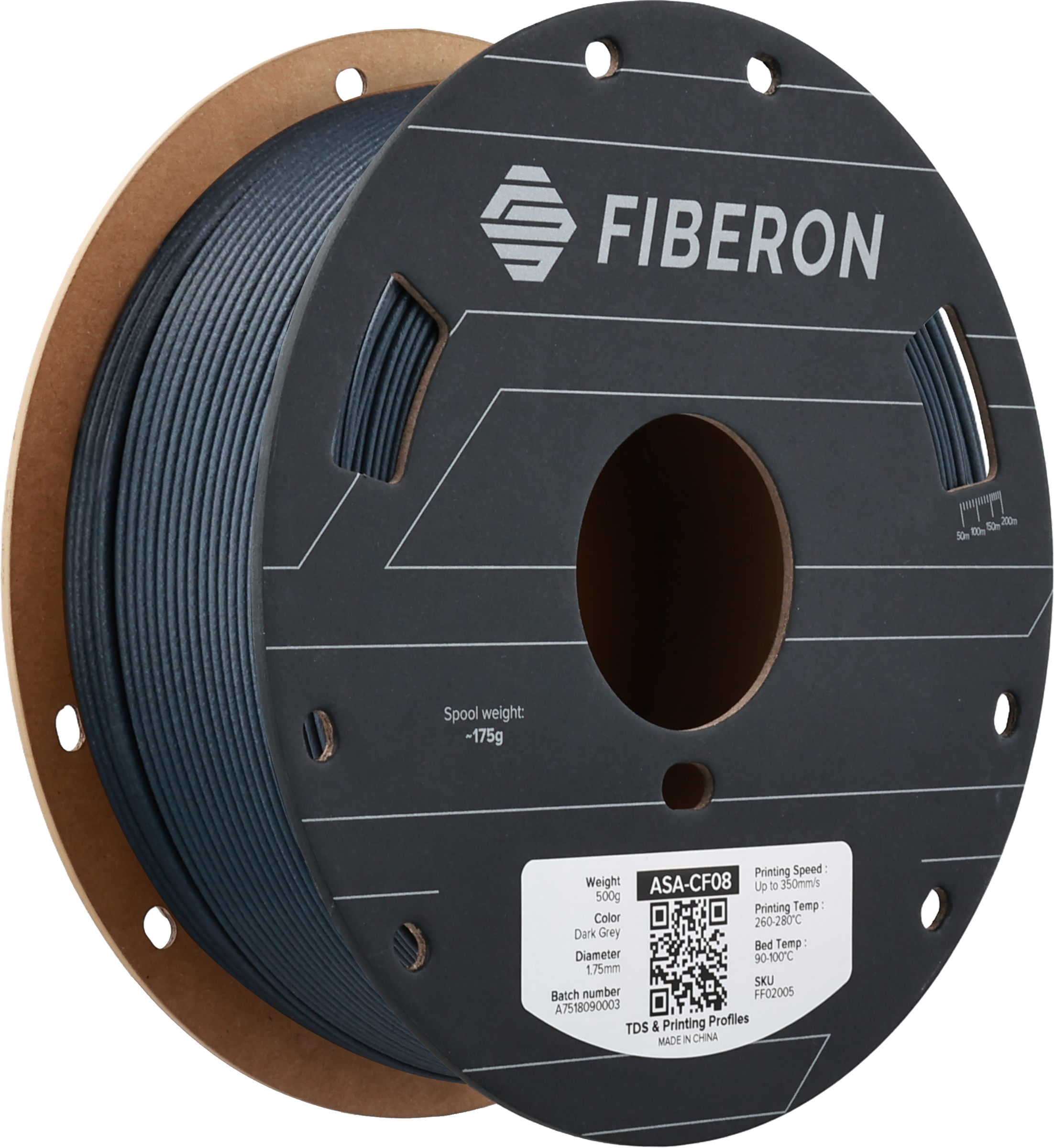 Fiberon™ ASA-CF08 es un filamento de alto rendimiento basado en acrilonitrilo-estireno-acrilato (ASA), reforzado con un 8% de fibras de carbono. El resultado es un material extremadamente rígido con gran estabilidad dimensional y una superficie mate de aspecto fino que combina excelentes propiedades mecánicas con una estética de calidad.