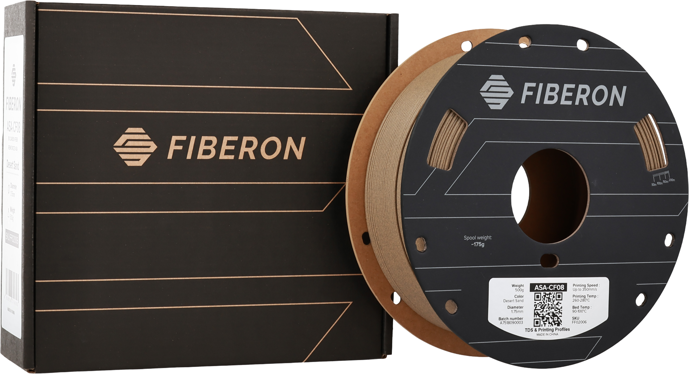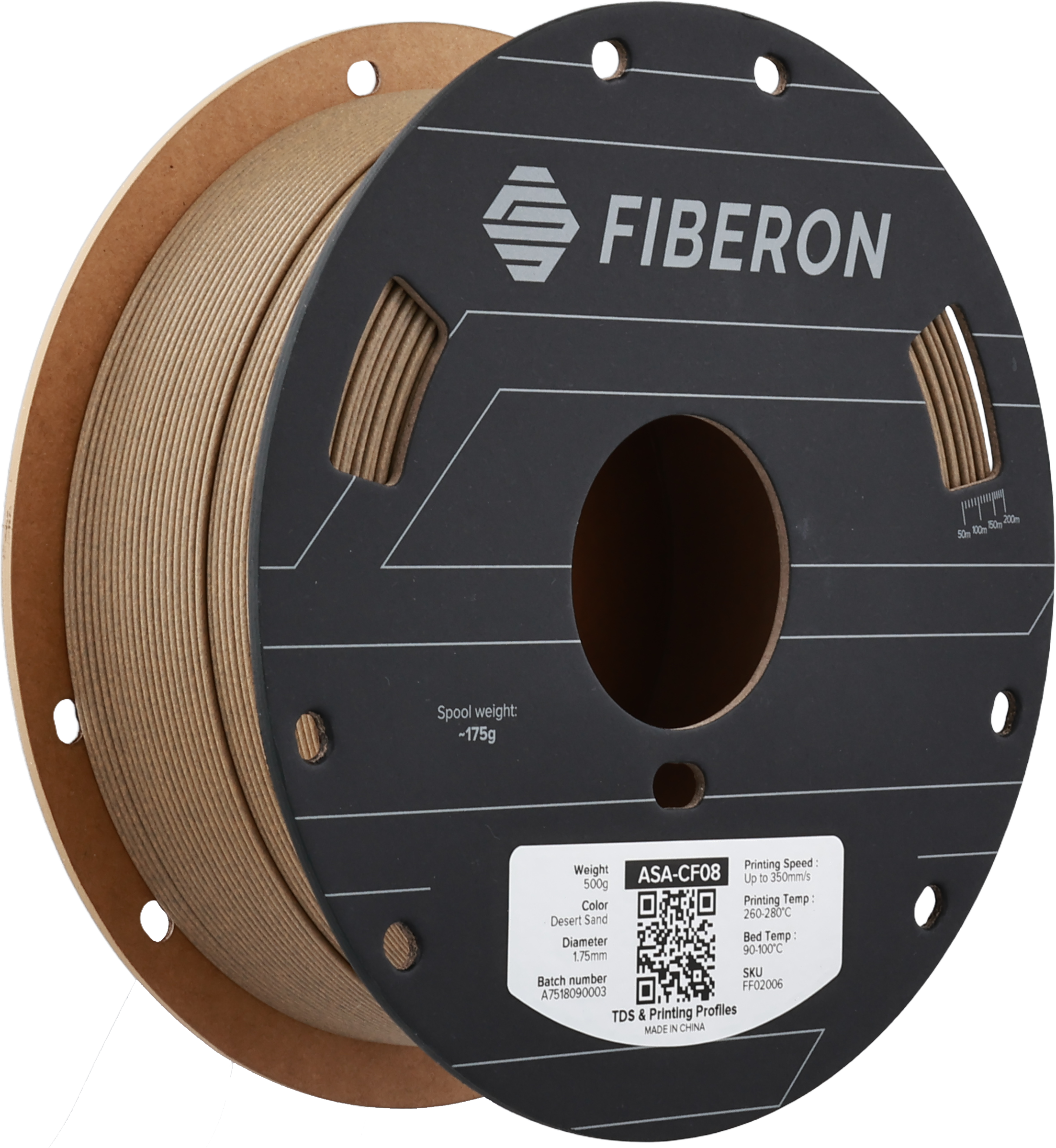 Fiberon™ ASA-CF08 es un filamento de alto rendimiento basado en acrilonitrilo-estireno-acrilato (ASA), reforzado con un 8% de fibras de carbono. El resultado es un material extremadamente rígido con gran estabilidad dimensional y una superficie mate de aspecto fino que combina excelentes propiedades mecánicas con una estética de calidad.