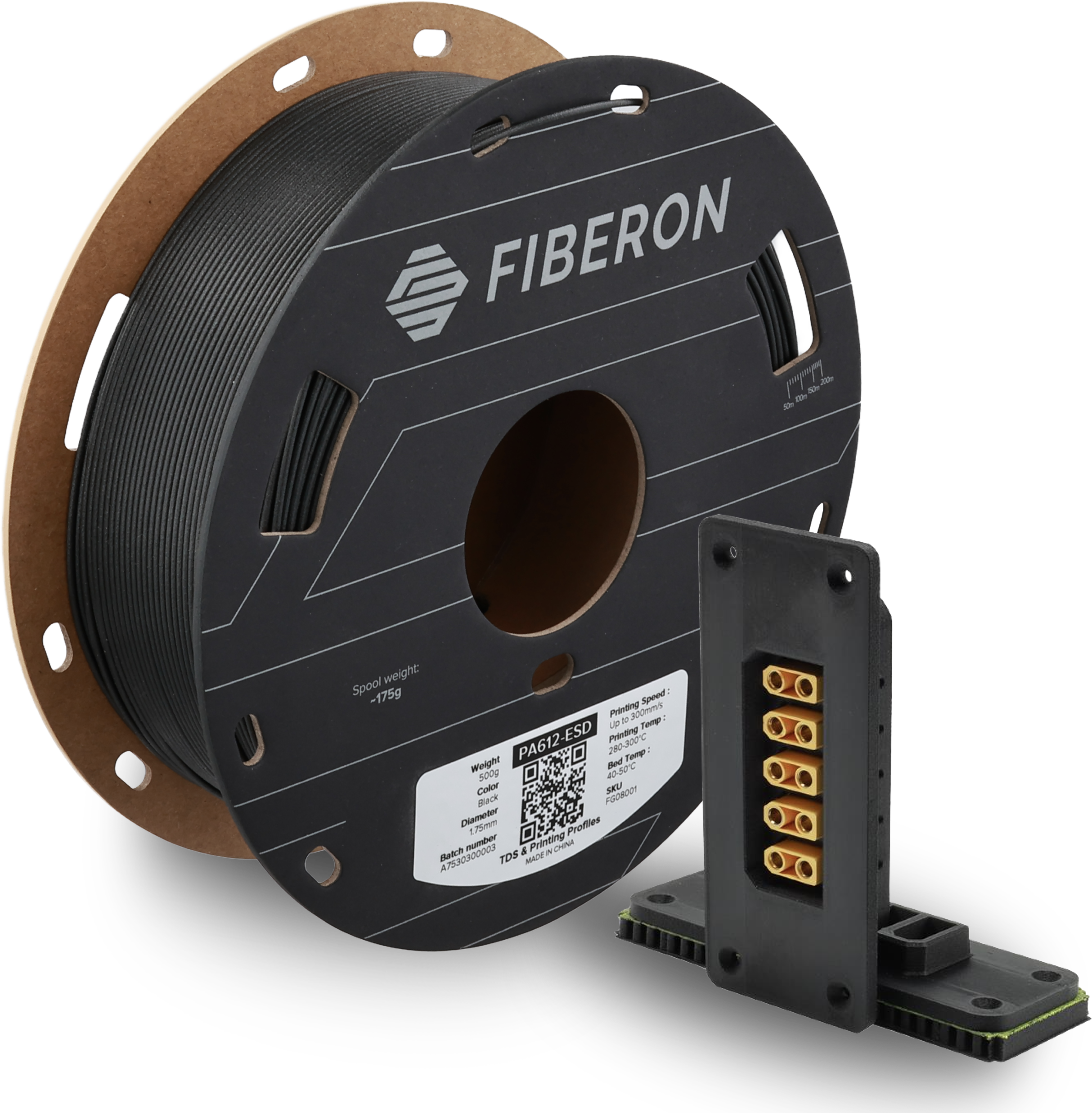 Polymaker Fiberon™ PA612-ESD es un filamento de nailon técnicamente optimizado basado en PA612 reforzado con fibras de carbono y nanotubos de carbono. Ofrece una gran resistencia mecánica, estabilidad dimensional y una protección fiable contra las descargas electrostáticas (ESD).