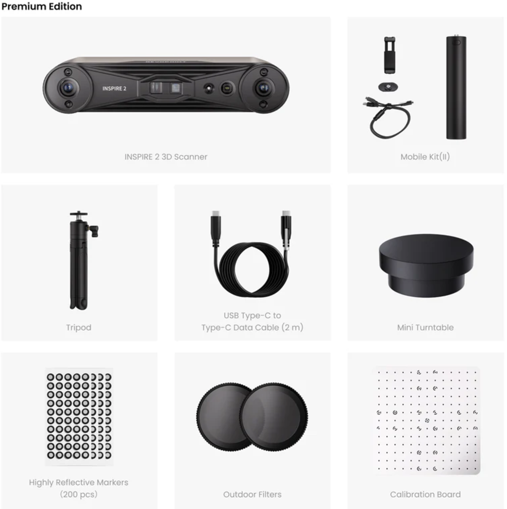 | 1 Escáner 3D INSPIRE 2 1 Trípode 1 USB Tipo-C a Tipo-C, 2 m de longitud 1 Mini plato giratorio 200 Marcador altamente reflectante Filtro Outfoor 1 Mesa de calibración |