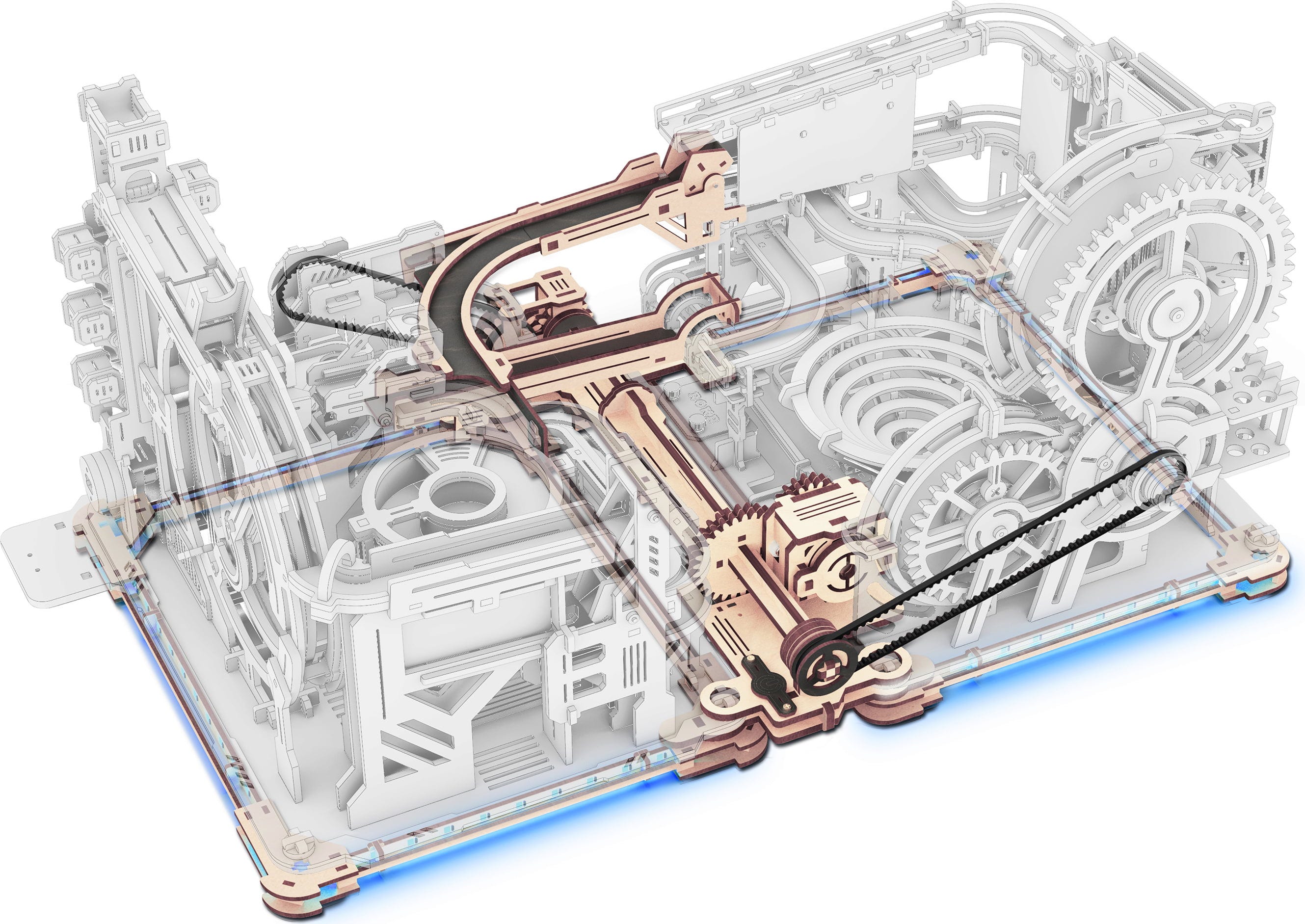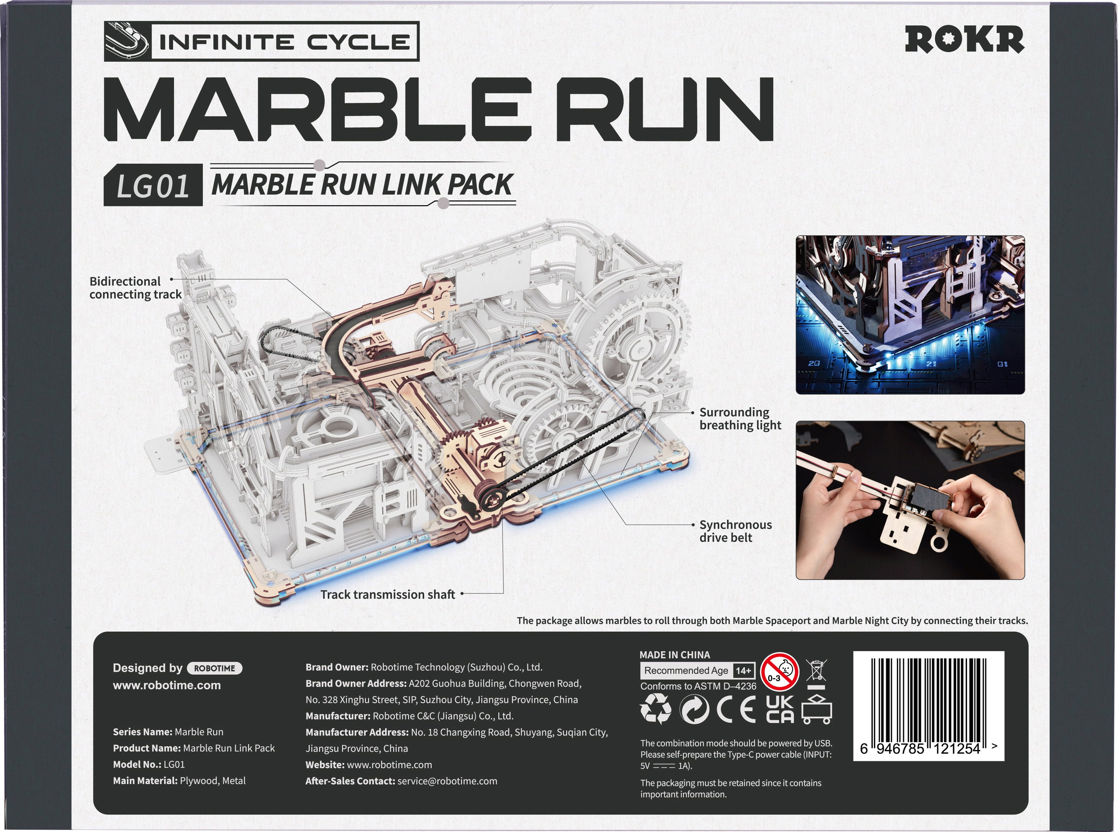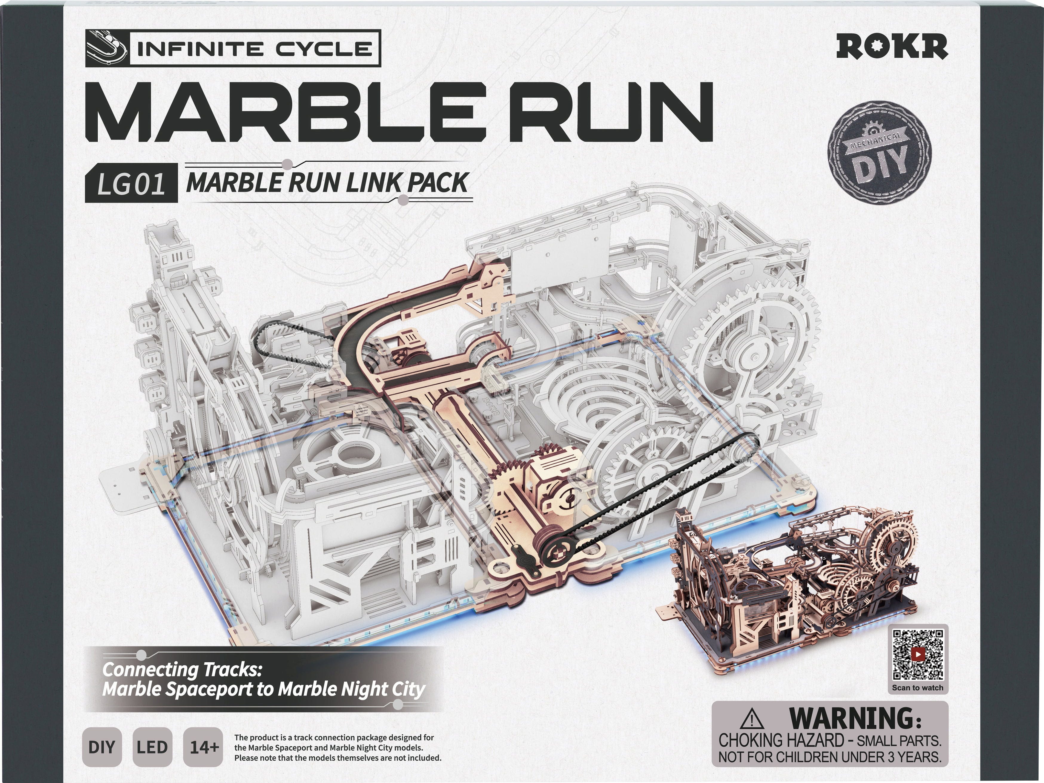 Algunas ciudades nunca dejan de crecer. Con el ROKR Link Pack puedes conectar la Marble Night City con el Marble Spaceport. El resultado es una red más grande de pistas de canicas, motorizadas e iluminadas por tiras de LED azules.