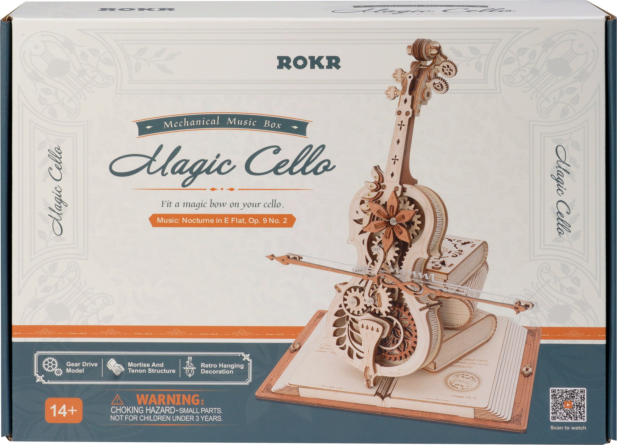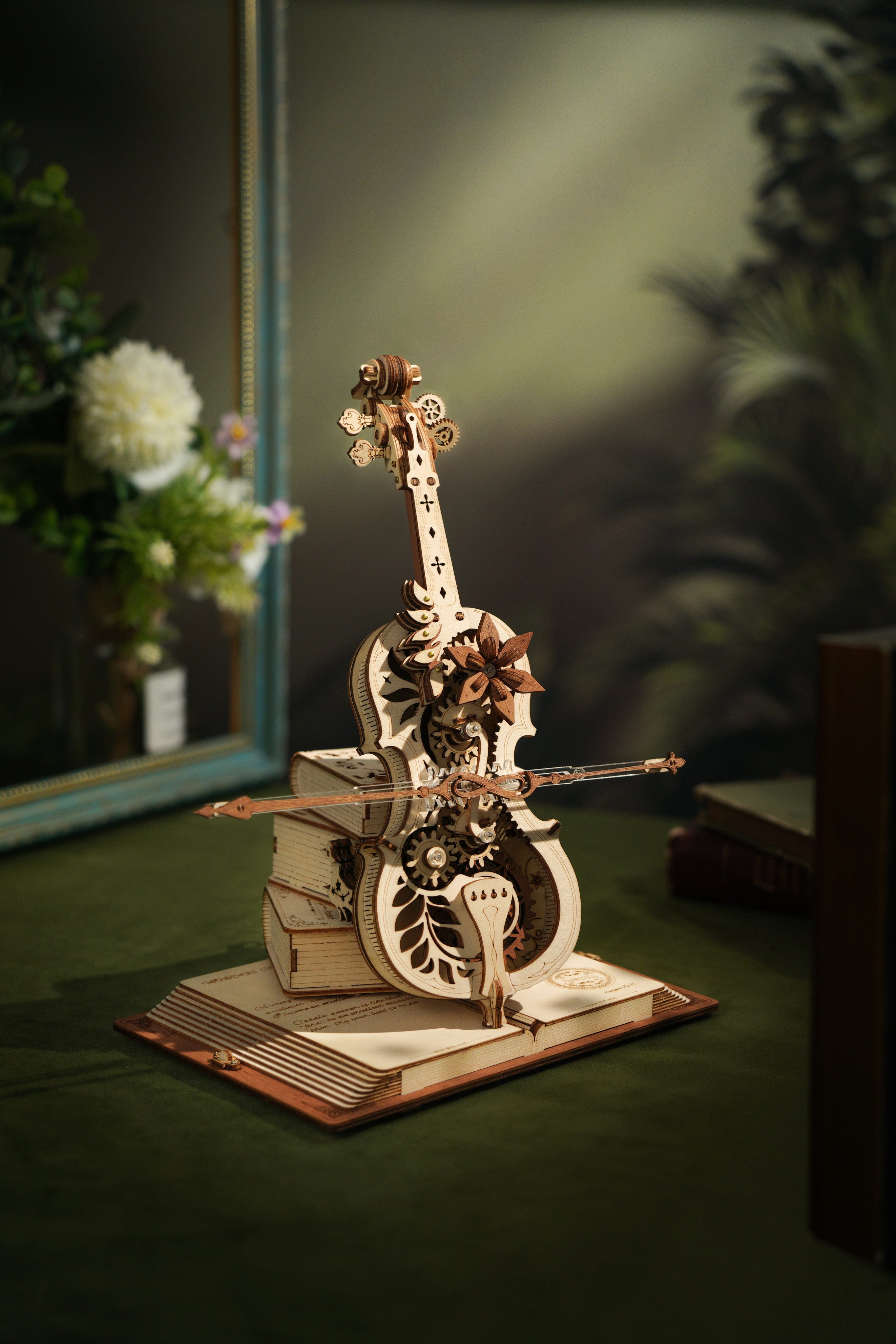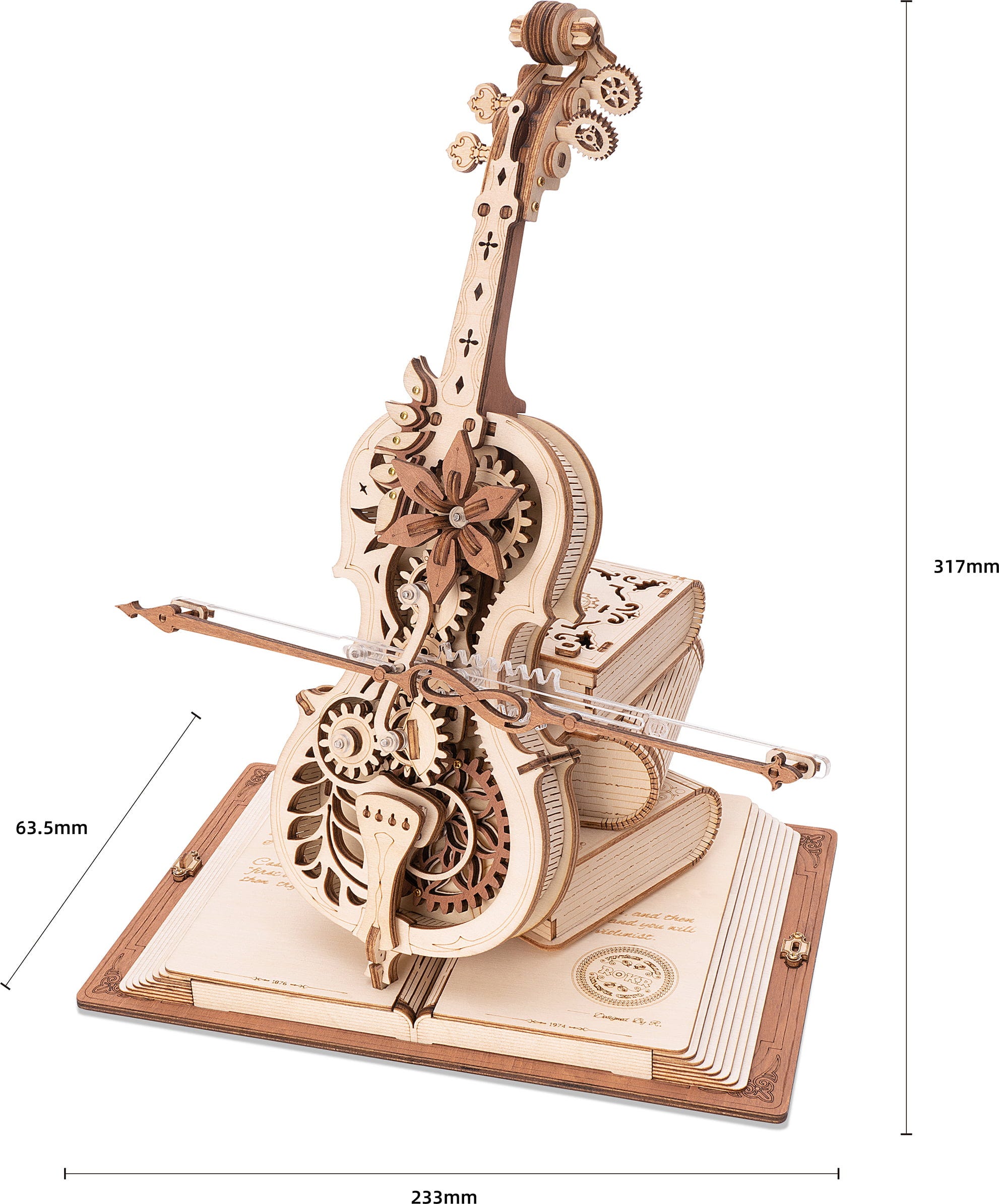 El Magic Cello ROKR es un puzzle de madera en 3D que combina música, movimiento y fantasía. A partir de finos componentes de madera surge un violonchelo vertical de estilo vintage, que descansa sobre un grimorio abierto y se apoya en una pila de libros mágicos. El conjunto parece salido directamente de una sala de música encantada.