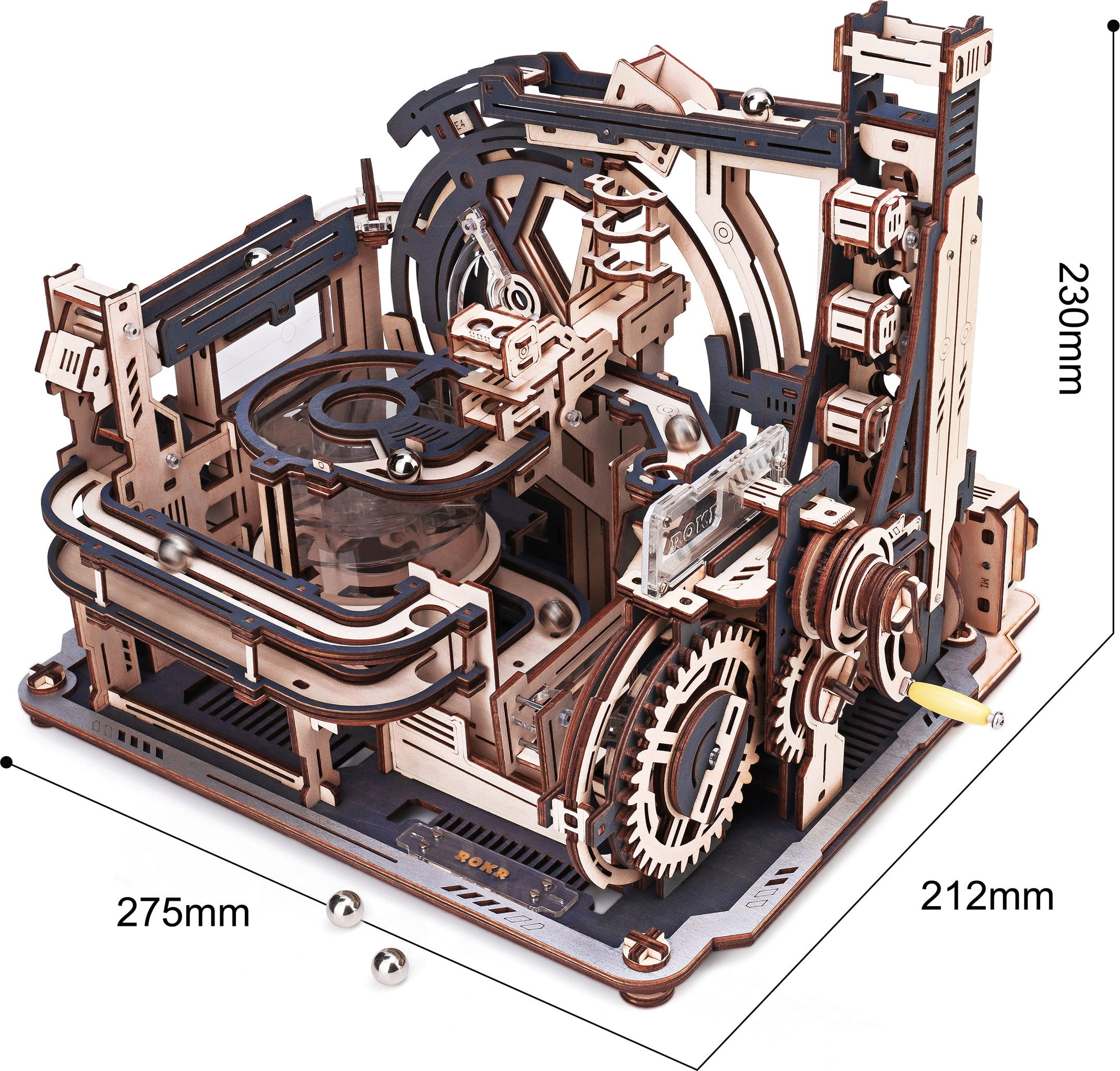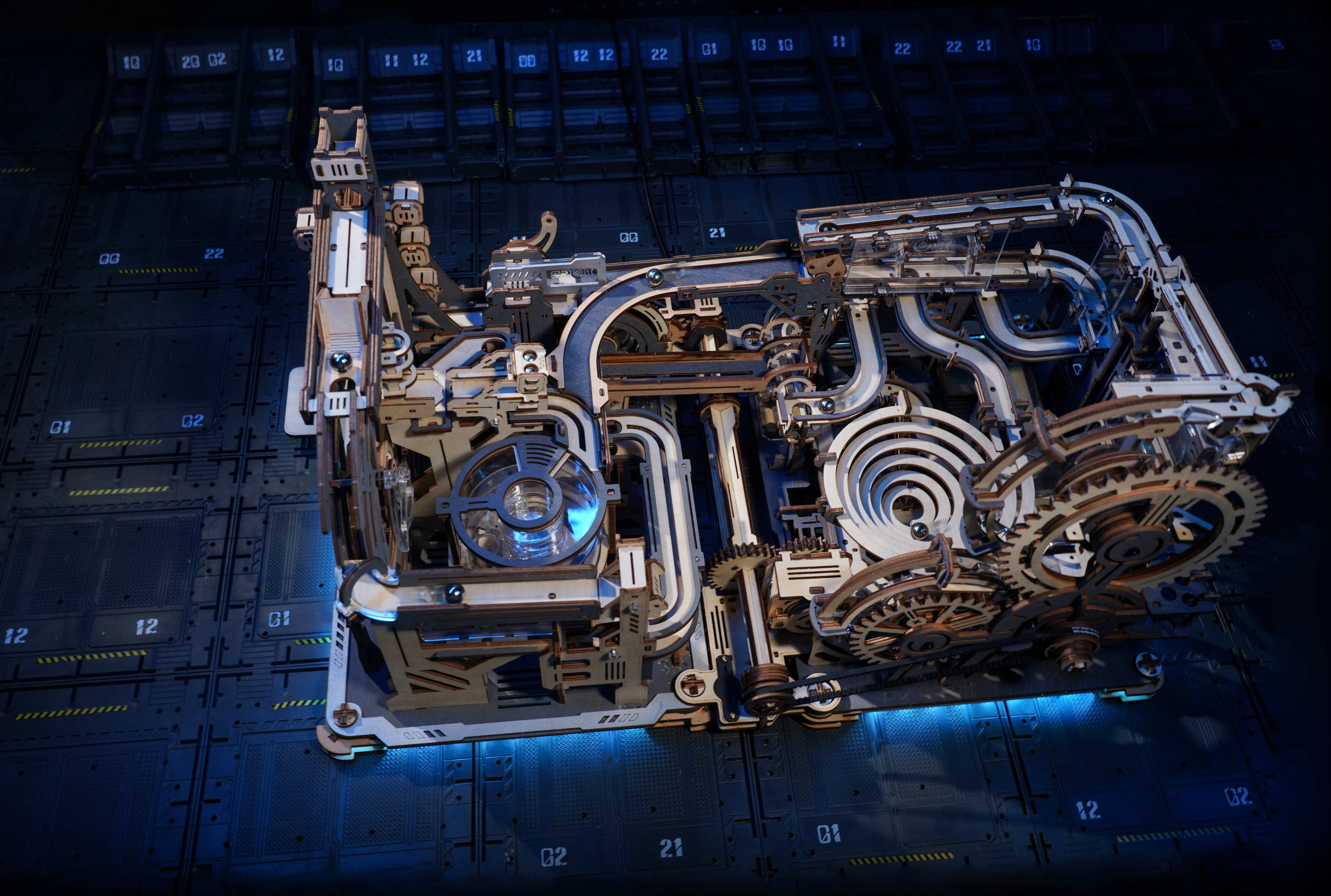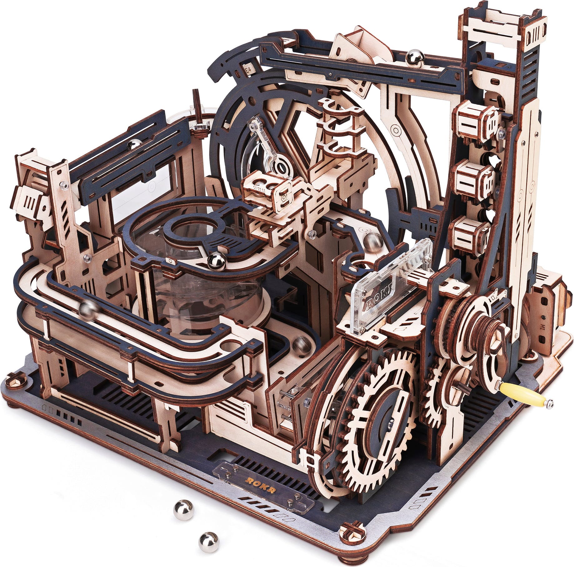 Bienvenido al Marble Spaceport. El ROKR Marble Space port es un rompecabezas mecánico de madera en 3D que reproduce una estación espacial futurista en miniatura. En lugar de cohetes, las bolas de acero aceleran, cambian de carril, son desviadas y vuelven a entrar en el sistema, guiadas por una ingeniosa mecánica.