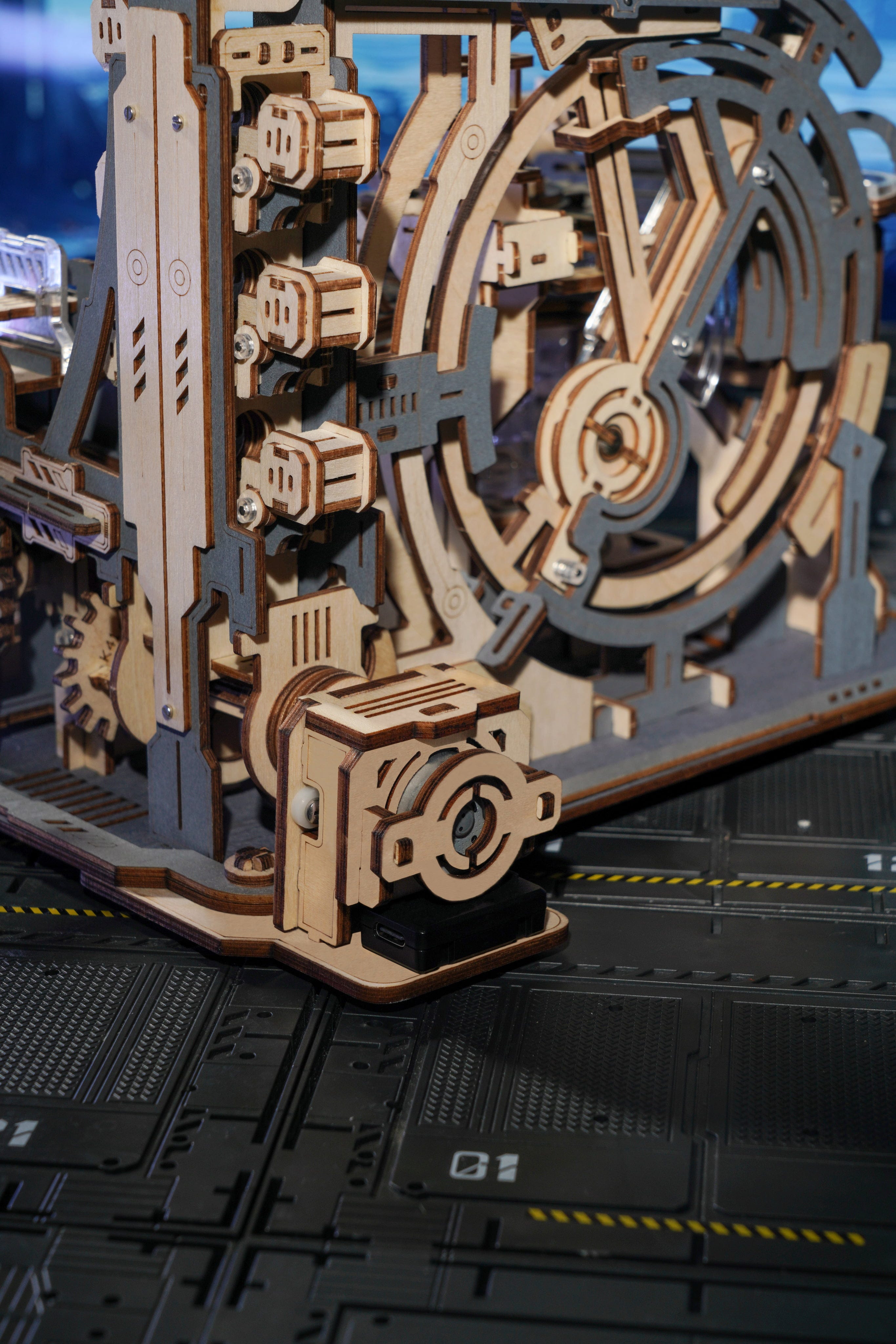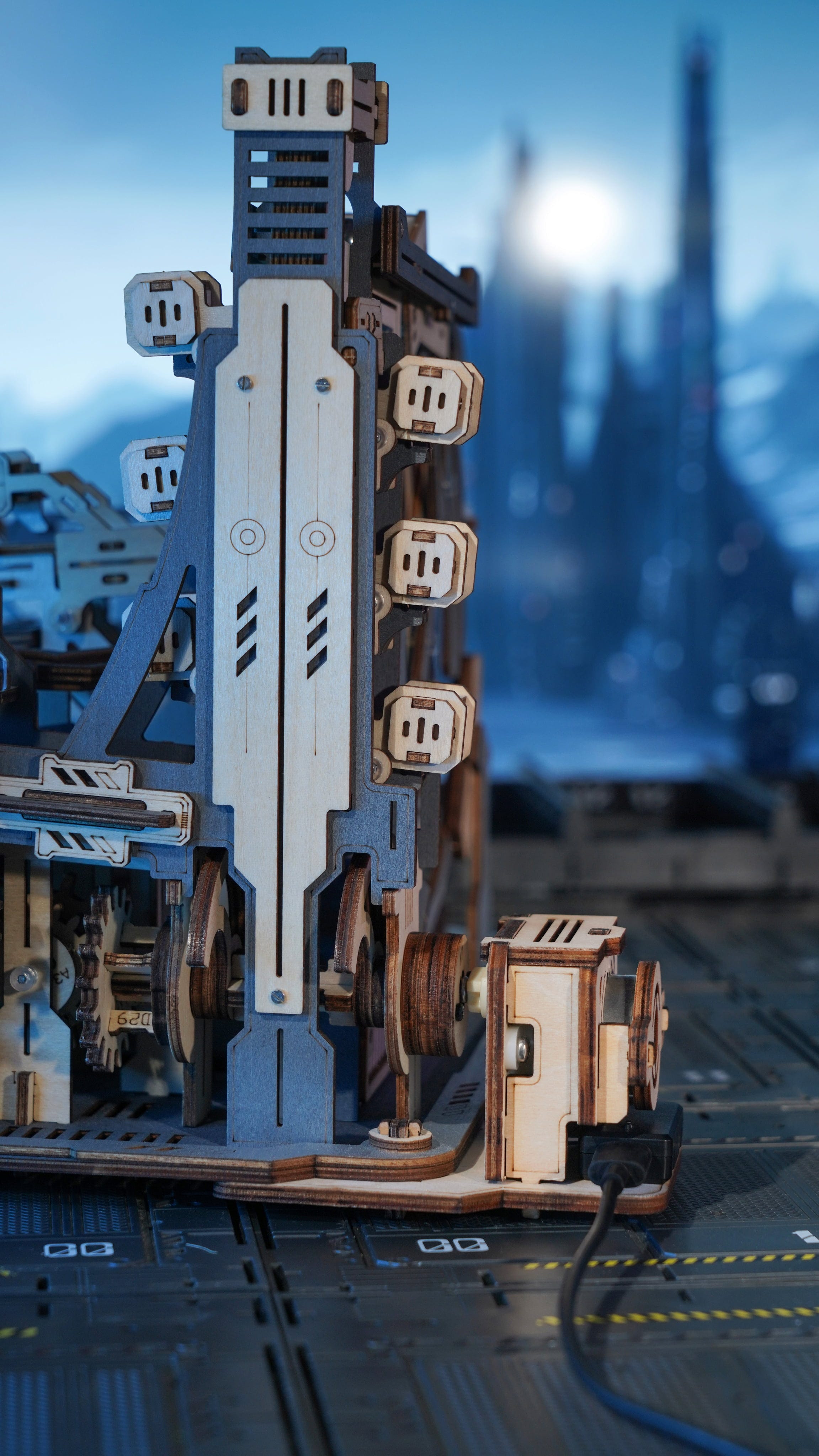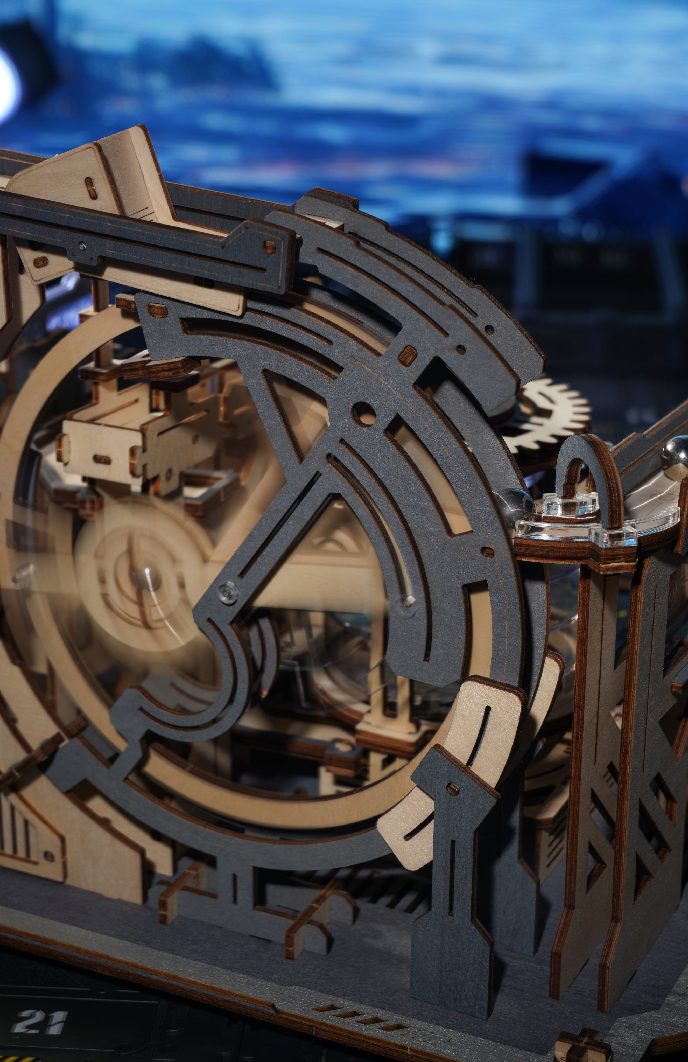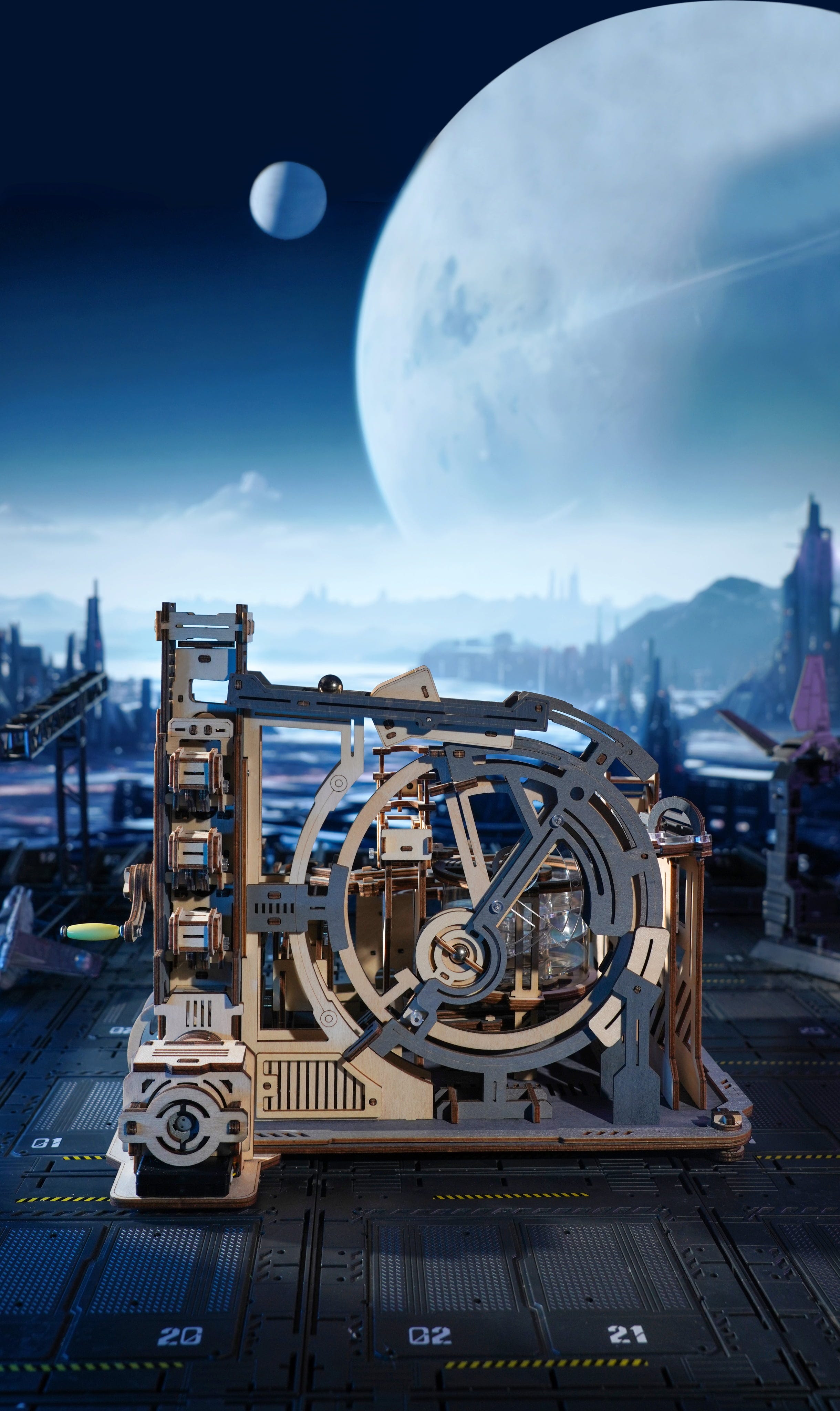 Bienvenido al Marble Spaceport. El ROKR Marble Space port es un rompecabezas mecánico de madera en 3D que reproduce una estación espacial futurista en miniatura. En lugar de cohetes, las bolas de acero aceleran, cambian de carril, son desviadas y vuelven a entrar en el sistema, guiadas por una ingeniosa mecánica.