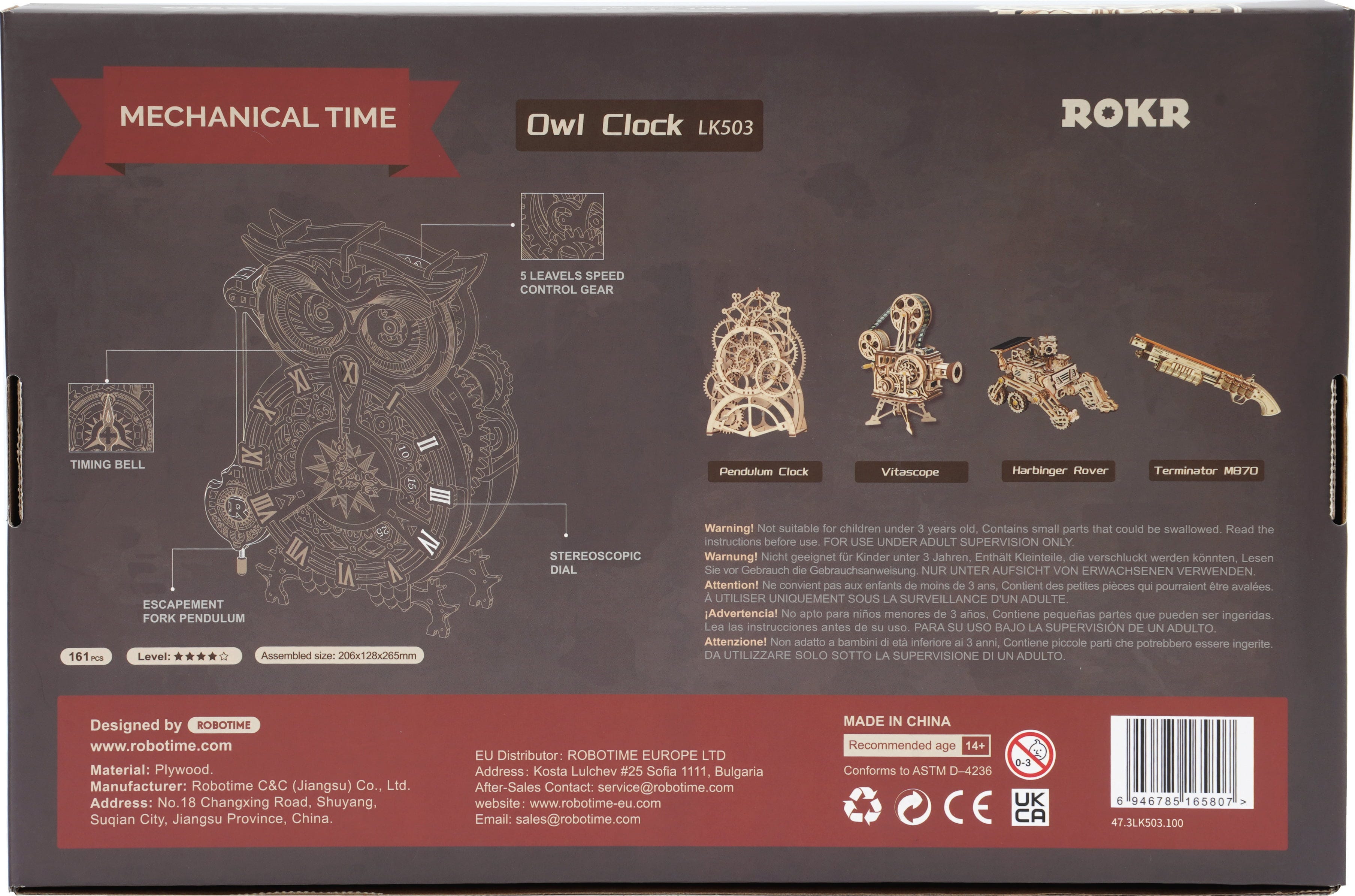 ROKR Owl Clock es un rompecabezas de madera en 3D que se transforma en un reloj totalmente funcional, finamente tallado, con mecánica visible y lleno de personalidad. A partir de numerosos componentes de madera toma forma un búho que no sólo es decorativo, sino que mide el tiempo con fiabilidad.