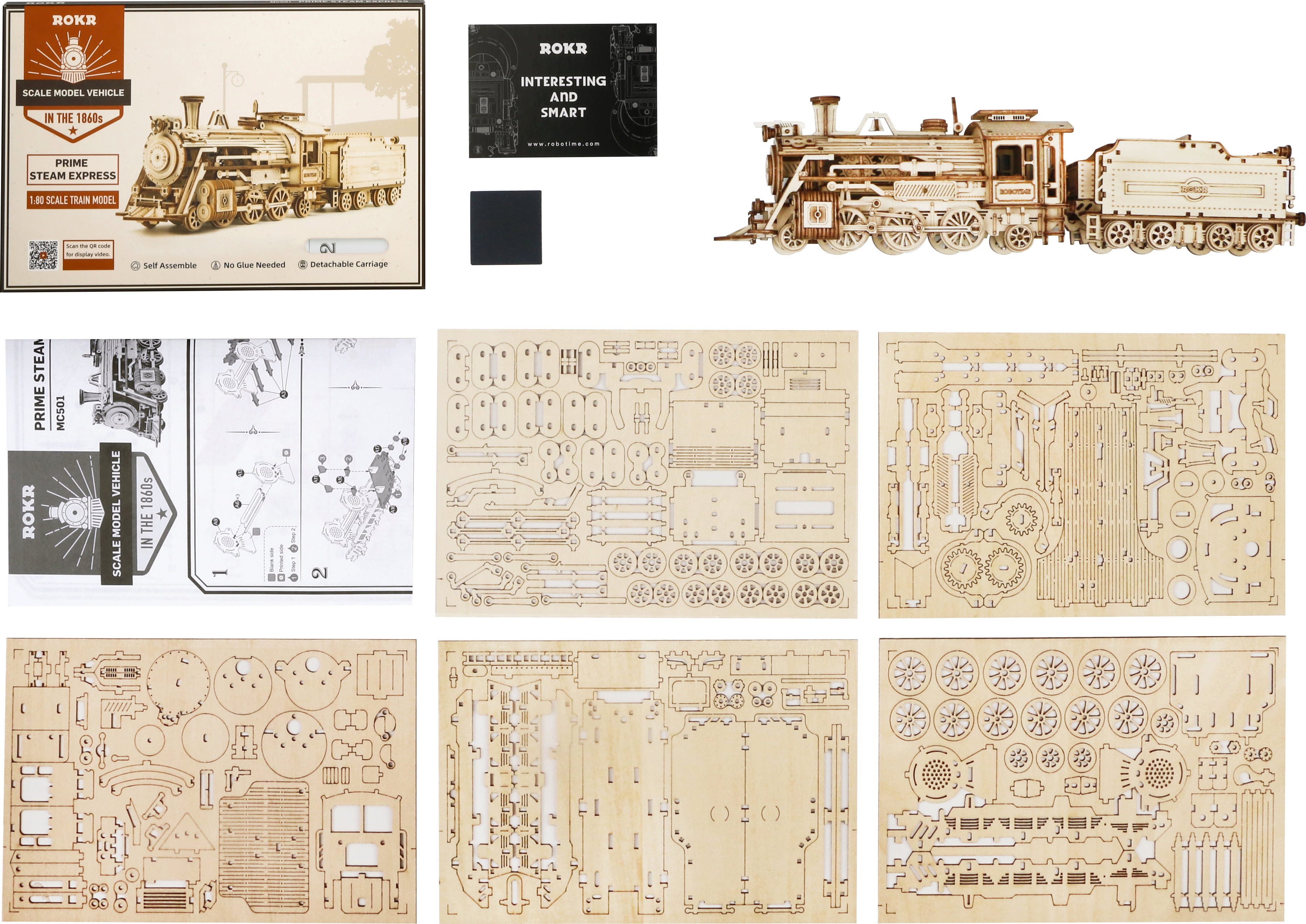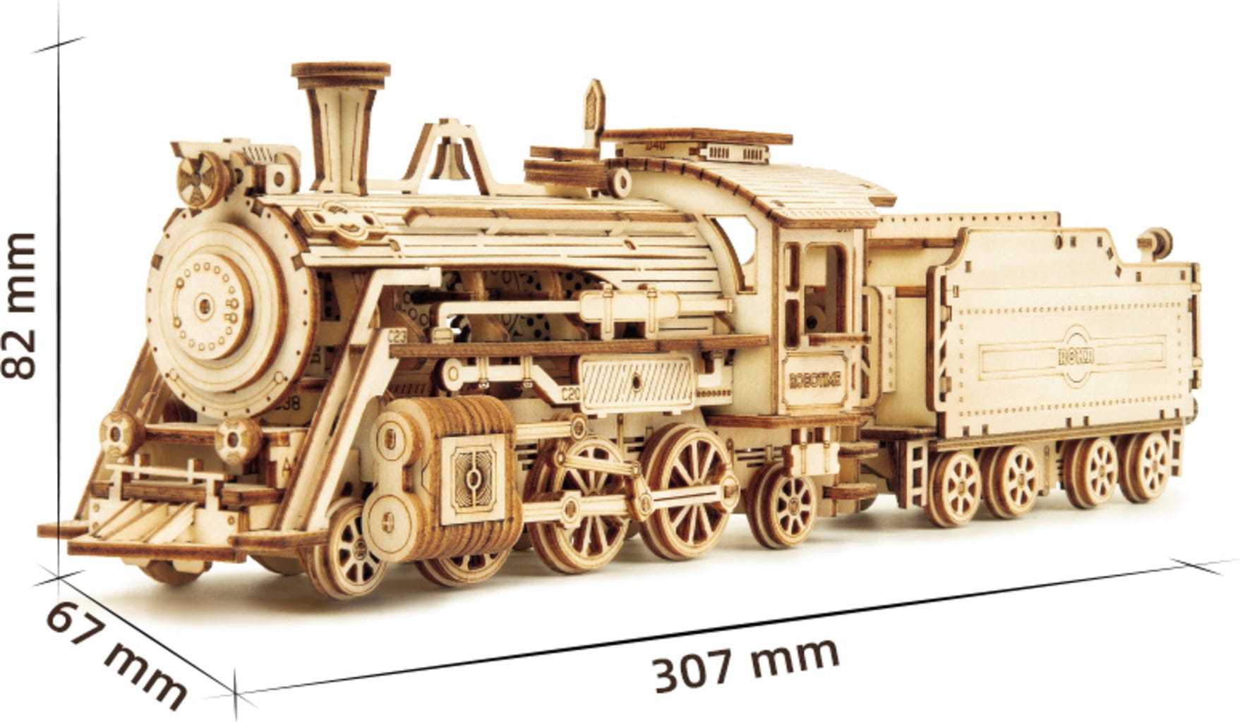 Tecnología táctil: Todos los componentes están hechos de madera contrachapada cortada a láser, preacabados con precisión y con una superficie agradablemente lisa. El proceso de ensamblaje se realiza sin pegamento. En su lugar, ingeniosas uniones entrelazadas y sofisticados mecanismos se conectan entre sí. Engranajes, ejes y movimientos permanecen visibles, plasmando con precisión el carácter mecánico de la locomotora.