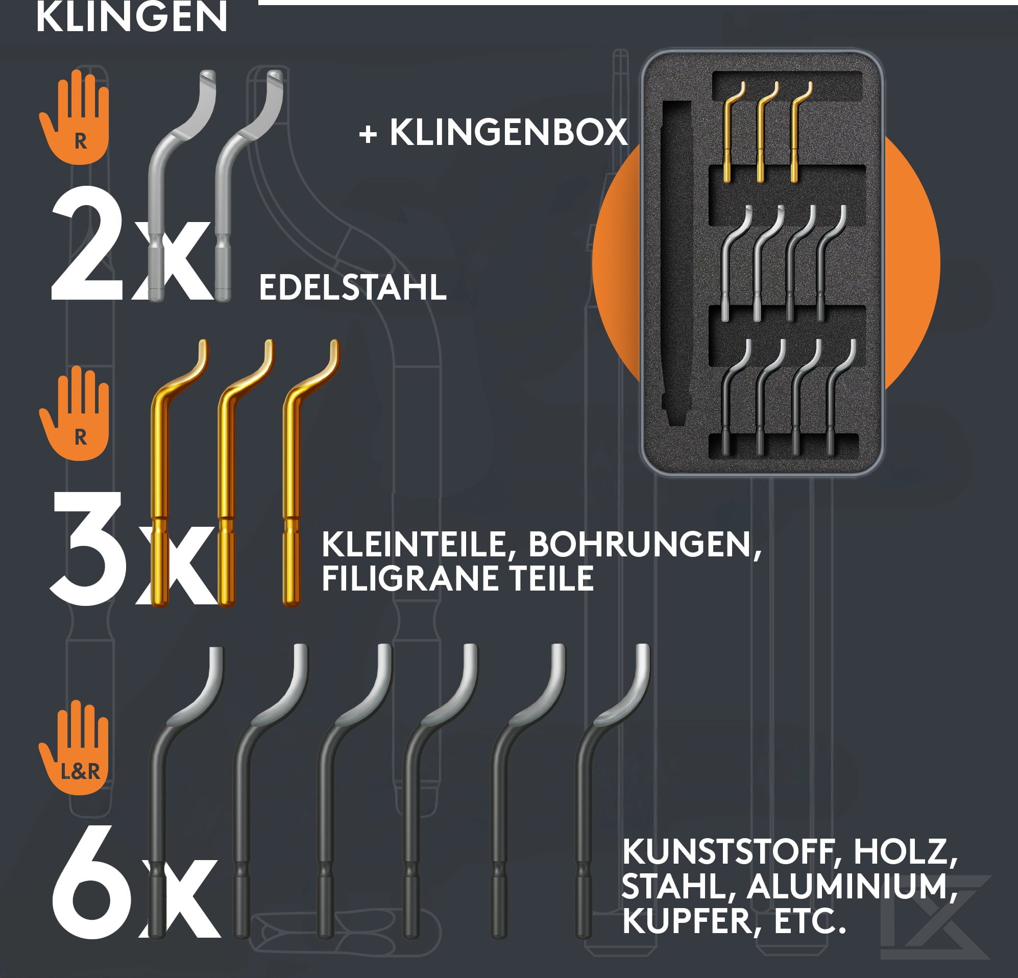 El deburrer ruthex es la herramienta perfecta para eliminar bordes, astillas y deshilachados en piezas y piezas impresas en 3D. Las cuchillas giratorias de 360° y súper afiladas están hechas de acero para herramientas HSS robusto y duradero y son adecuadas tanto para diestros como para zurdos gracias al corte simétrico.